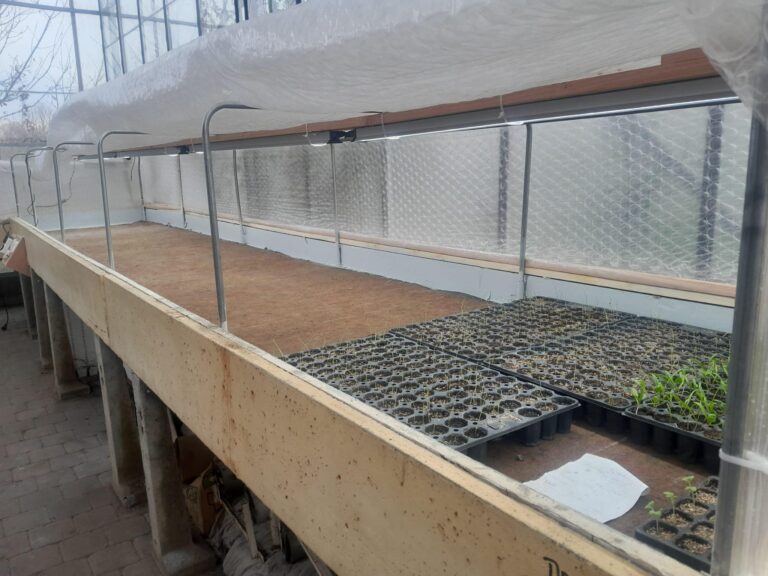 Jesse Opdam van Coöperatie Herenboeren Land van Weert: “Wij hebben ongeveer 10 m2 verwarmde tafels met verlichting. Na de kieming gaan de trays op een palletvloer in de kas. Wij telen groente voor 350 mensen en hebben de afgelopen jaren steeds meer zelf opgekweekt, dit jaar heb ik alleen de zaaiuien en de knolselderij nog besteld.”