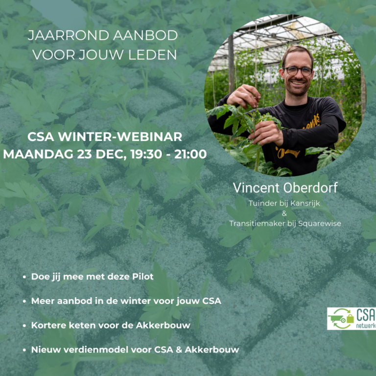 Tijdens dit webinar vertelt Vincent Oberdorf, van CSA- @tuin.kansrijk over samenwerking met 2 (bio)akkerbouwers: @boerderij_aan_de_dijk en @zonnegoed_farm